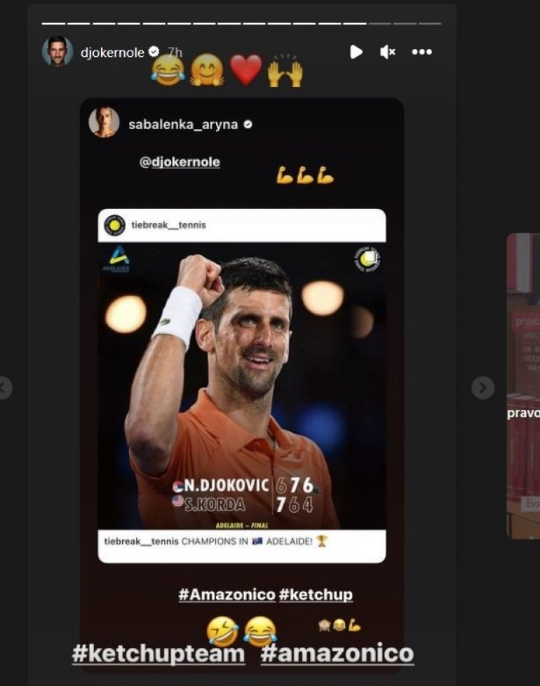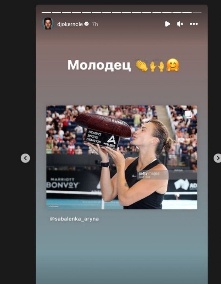 Ona je u finalu savladala Čehinju Lindu Noskovu koja je, kao 104. na VTA listi, pružila odličan otpor i poklekla pred petom teniserkom sveta tek posle 106 minuta igre - na kraju je bilo 6:3, 7:6(4) za favoritkinju. A upravo je Sabalenka poslala Novaku poruku na Instagramu, uz misteroizone reči na fotografiji šampiona u muškoj konkurenciji:
