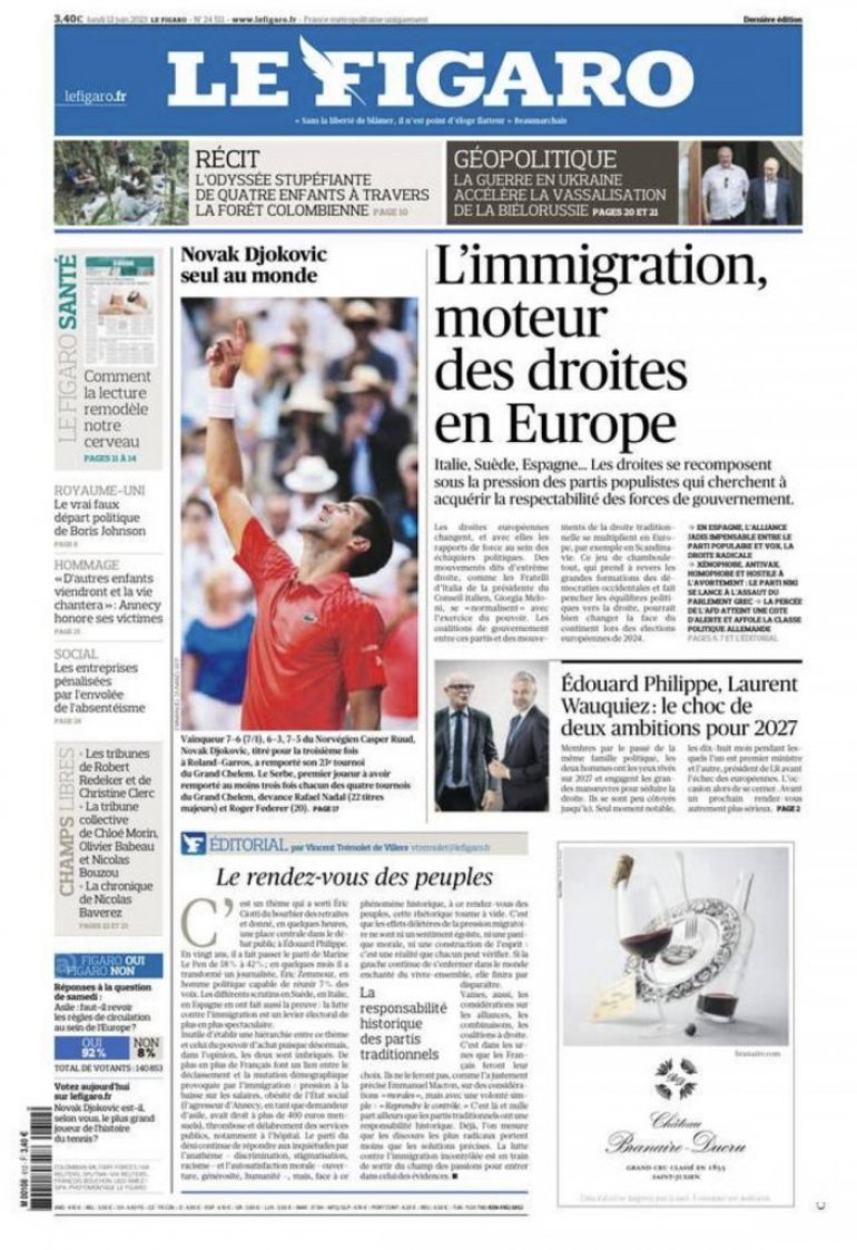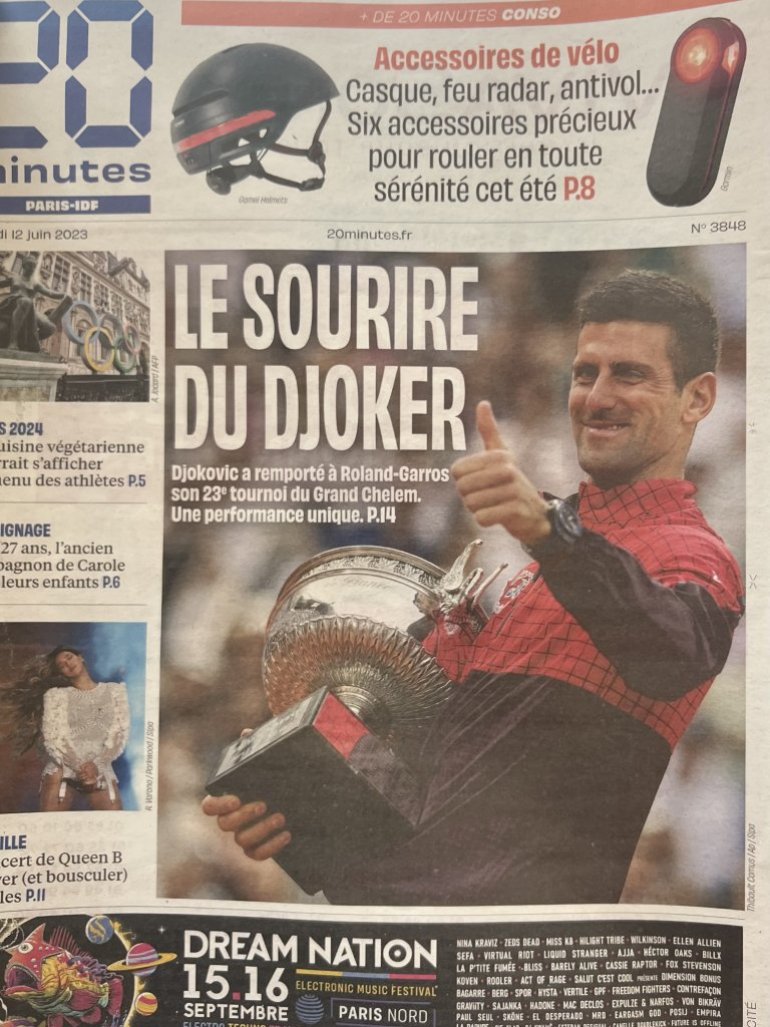 Informativni list "20 minuta" piše na naslovnici o "Džokerovom osmehu", čitani regionalni "Jugozapad" (Sid Uest) je preko cele prve strane ispisao "Sam na svetu" uz Novakovu fotografiju, sličan naslov odabrao je i "Figaro", za "Parizjen" na prvoj strani "Kralj je Đoković"...