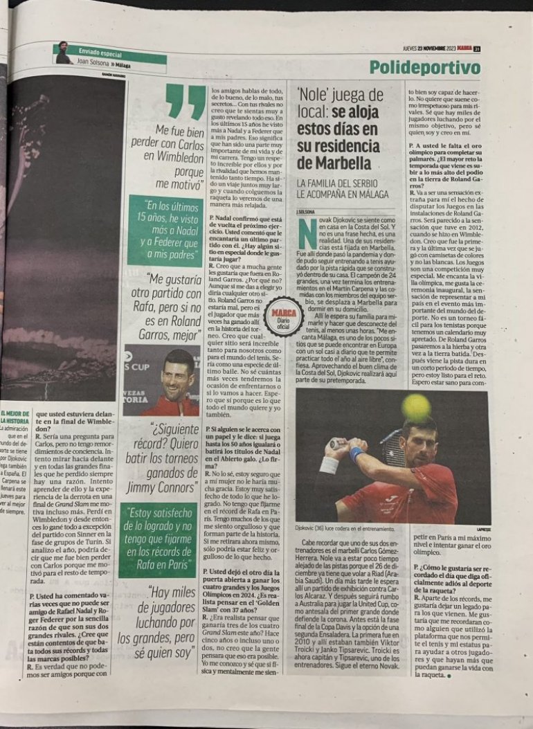 Nole je dao opširan intervju za najtiražniji španski dnevni list "Marku", a "Novosti" vam prenose i šta je rekao o svojim najvećim rivalima: