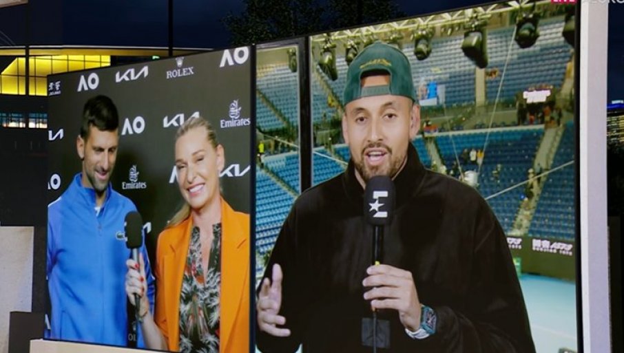 Nik Kirjos objašanjava Novaku Đokoviću, dok ga intervjuiše Barbara Šet, da je hteo da zbog Noleta uskoči među bahate navijače na Australijan openu / Screenshot / Eurosport