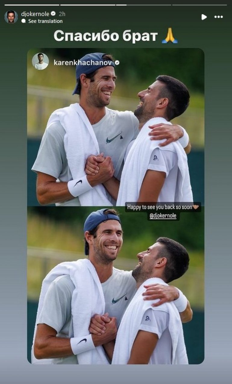 - Srećan sam što te vidim tako brzo na terenu - napisao je Hačanov. Nole je na to kratko odgovorio: "Hvala brate".