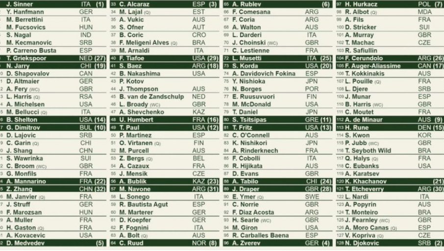 Italijan Janik Siner, najbolji teniser sveta, igraće u prvoj rundi protiv imenjaka Hanfmana iz Nemačke. Već u drugoj rundi bi Siner mogao da ide na zemljaka Matea Beretinija.