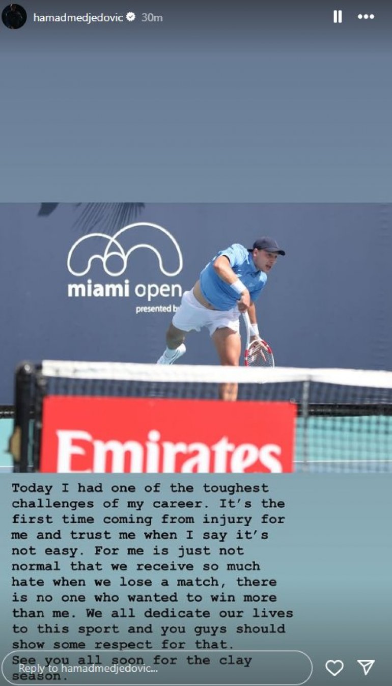 - Danas sam imao jedan od najtežih izazova u svojoj karijeri. Prvi put mi se dešava da se vraćam posle povrede i verujte mi kada kažem da to nije lako. Za mene jednostavno nije normalno da nas toliko mrze kada izgubimo meč, jer niko nije želeo pobedu više od mene. Svi mi posvećujemo svoje živote ovom sportu i trebalo bi da pokažete poštovanje prema tome. Vidimo se uskoro na šljaci! - rekao je Međedović.