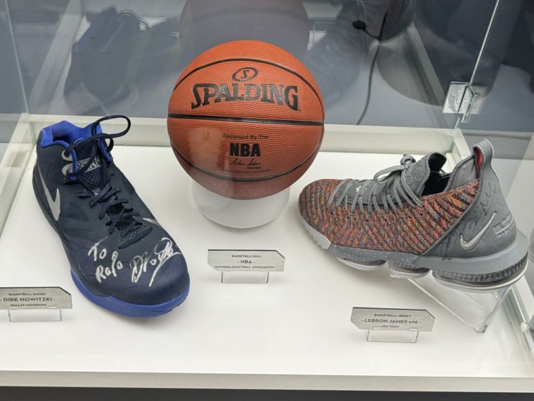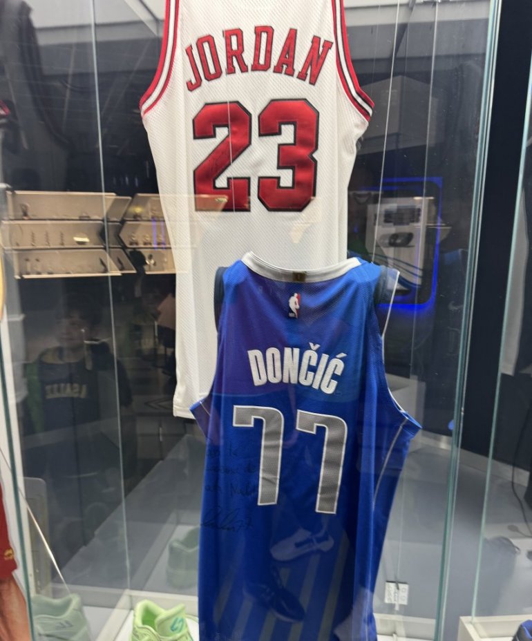 Dres s legendarnim brojem 23 i patike leteće basketaške legende Majkla Džordana. Sedamdeset sedmica na majici sad već bivšeg Dončićevog kluba Dalasa. Podugačke patike Dirka Novickog. Nisu zaostali ni Lebron Džejms i Po Gasol. Cela njegova figura u dresu španske reprezentacije uzdiže se između vitrina, a glava se klanja kako prođete pored nje, kao da je živa.