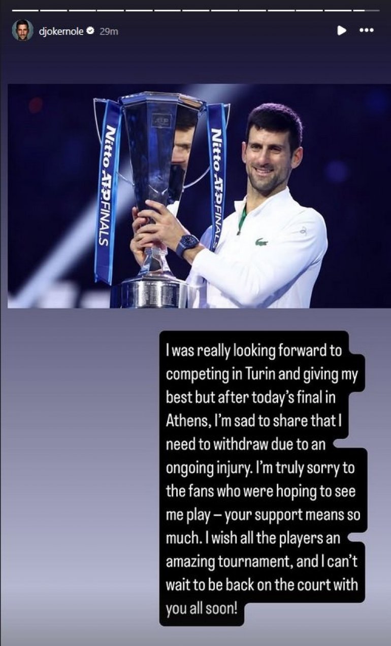 - Zaista sam jako želeo da se takmičim u Torinu i da dam sve od sebe, ali posle finala u Atini, nažalost, moram sa vama da podelim da moram da se povučem zbog povrede. Zaista mi je žao zbog svih navijača koji su se nadali da će me videti kako igram - vaša podrška znači mnogo. Želim svim igračima sjajan turnir i ne mogu da dočekam da se vratim na teren sa vama svima zajedno - napisao je Đoković na Instagramu.