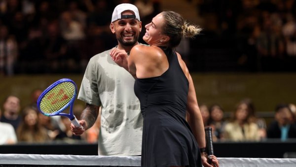 AUSTRALIJASKI teniser Nik Kirjos pobedio je večeras najbolju teniserku sveta Arinu Sabalenku rezultatom 6:3, 6:3 u egzibicionom meču "Bitka polova", koji se odigrao u Dubaiju.