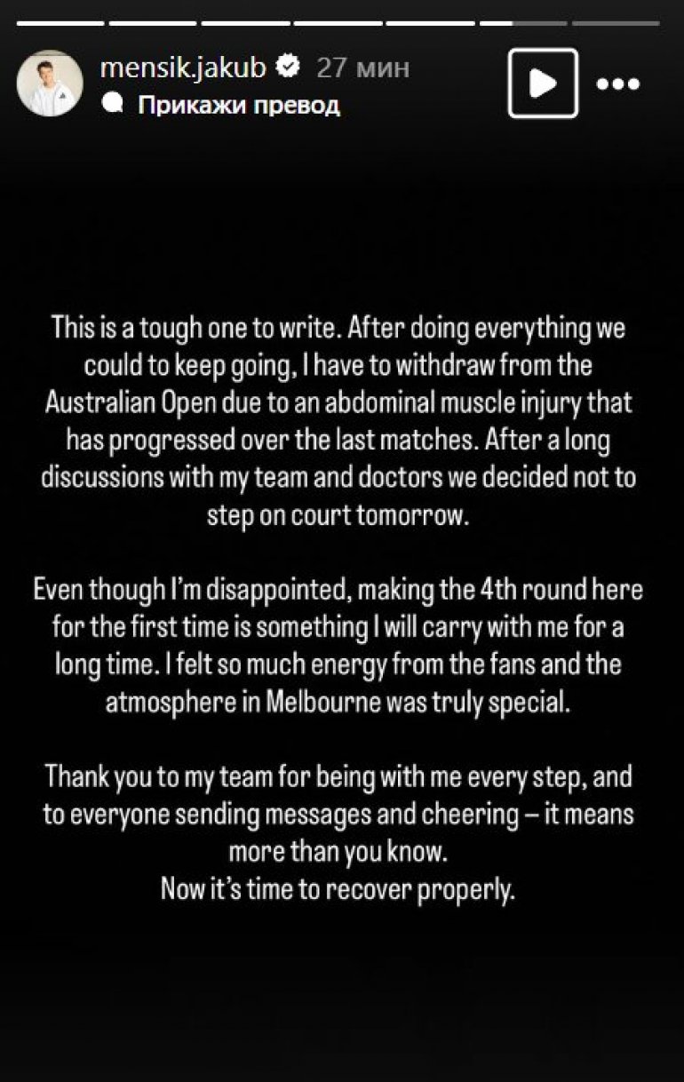 Hvala mom timu što je bio uz mene na svakom koraku, i svima koji šalju poruke i navijaju – to mi znači više nego što mislite. Sada je vreme za pravi oporavak - napisao je Menšik na društvenim mrežama.