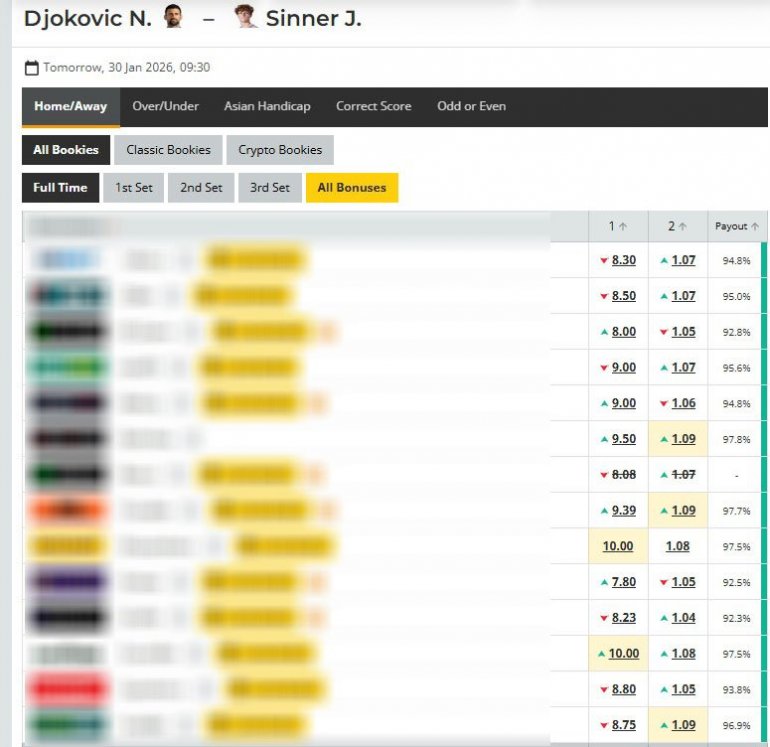 Kvote u kladionicama na meč Novak Đoković - Janik Siner na Australijan openu 2026 / Screenshot