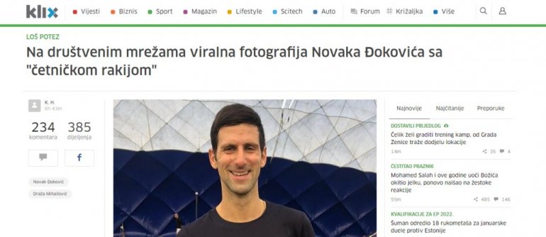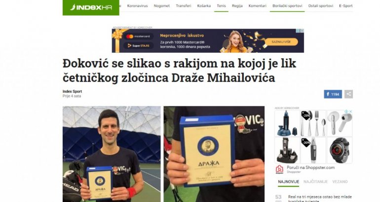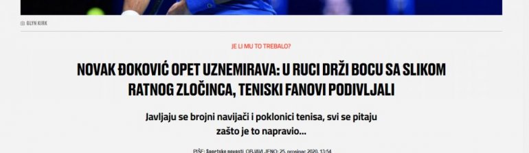"Na toj spornoj boci rakije je lik nekadašnjeg vođe srpskih četnika, Draže Mihailovića. Voli Novak s vremena na vrijeme malo "bocnuti", voli malo isprovocirati, voli da se podigne prašina. Ali, možda je ovoga puta malo pretjerao, s obzirom na to da veliki dio svjetskih medija i navijača neće naklono gledati na ovakve stvari. Istina, Srbi su prije pet godina rehabilitirali ratnog zločinca Mihailovića, ali Novaku ovaj dio "imidža" baš i nije potreban. Rakiju mu je uručio vlasnik tvrtke koja ju proizvodi, a na njoj osim slike četničkog vođe stoji i natpis: "proizvedena u čast i slavu ravnogorskim junacima"", piše "Jutarnji" na sportskim stranicama.