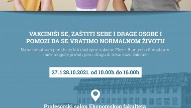 NA Ekonomskom fakultetu u Beogradu 27. i 28. oktobra biće otvoren punkt za vakcinaciju, a u utorak 26. oktobra u 11.30 časova biće organizovan vebinar "Vakcinacija protiv KOVID 19".