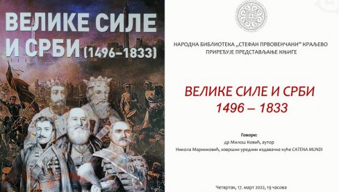 U Narodnoj biblioteci „Stefan Prvovenčani“ u Kraljevu, večeras će od 19 sati biti priređeno predstavljanje knjige „Velike sile i Srbi (1496–1833) dr Miloša Kovića, profesora na Odeljenju za istoriju Filozofskog fakulteta Univerziteta u Beogradu.