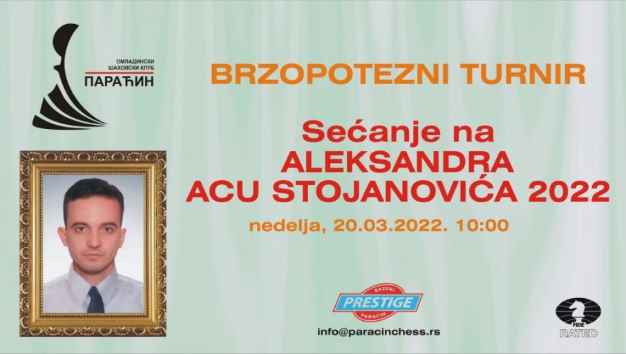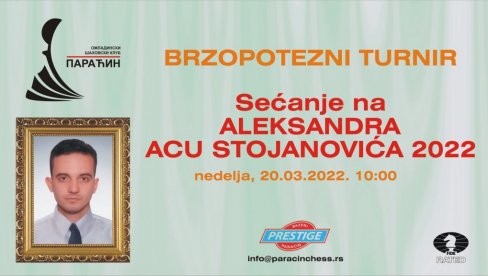 U pitanju je memorijalno takmičenje „Sećanje na Aleksandra Acu Stojanovića 2022“. Prijavljivanje učesnika je u toku i traje do sutra do 9,50 sati, a početak turnira je deset minuta kasnije. Igraće se 11 kola, a organizator je Omladinski šahovski klub “Paraćin“.