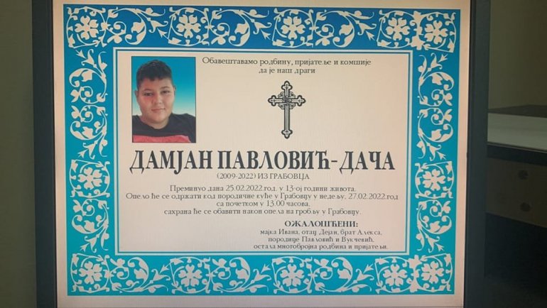 DRUGOVI Damjana Dače Pavlovića (13), dečaka iz Grabovca kod Trstenika koji je 25. februara preminuo od posledica tumora, oslikali su mural sa njegovim likom na zgradi osnovne škole.