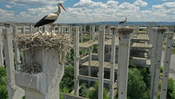 IZ gnezda na betonskim stubovima nedovršene zgrade pokraj auto-puta na Klisi u Novom Sadu, ravnicom se razleže cvrkut belih roda, među kojima je i 70 mladunaca.