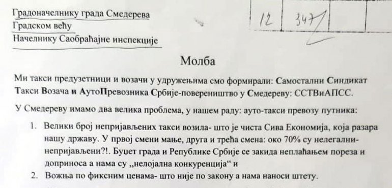 - Smederevo ima veliki broj neprijavljenih taksista. U prvoj smeni manje, a u drugoj i trećoj i do 70 odsto su nelegalni, čime je zakinut budžet i grada i države jer ne plaćaju porez i doprinose, a nama su nelojalna konkurencija. Ovo traje godinama i postalo je neizdrživo - stoji, pored ostalog, u pismu koje potpisuje poverenik Samostalnog sindikata taksista i auto-prevoznika za Smederevo, Miloš Ristić.