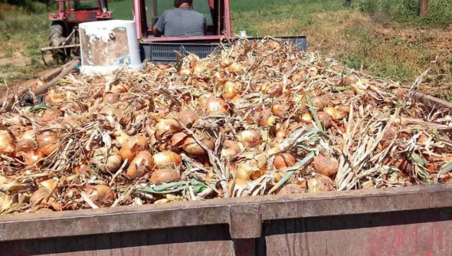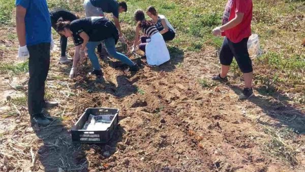 Učenici Poljoprivredno-veterinarske škole u Rekovcu, smer poljoprivredni tehničar, učestvuju u vađenju crnog luka sa školske ekonomije.