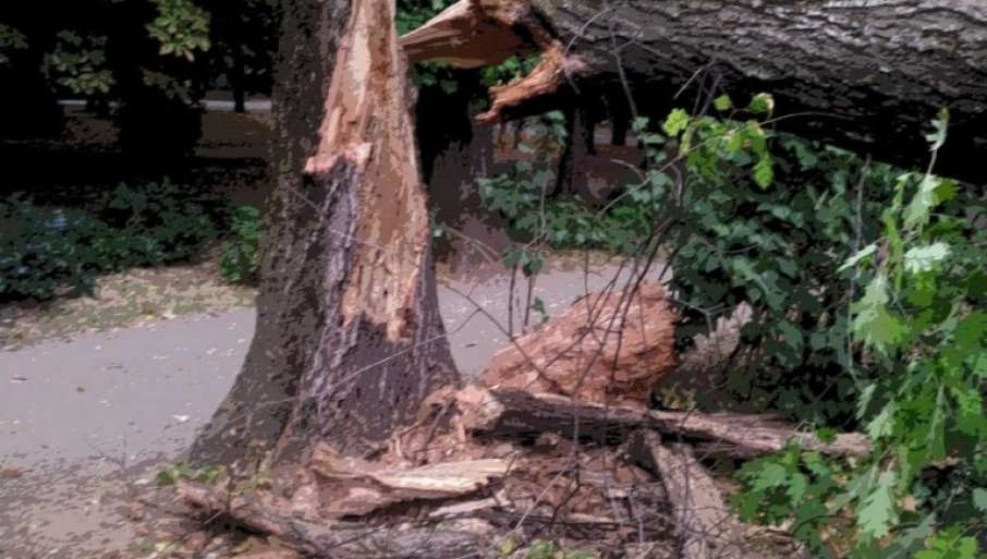 Debelo stablo, koje se nalazi u desnom delu ove zelene oaze, potpuno je puklo pri korenu, obrušilo se preko parkovske ograde i polomilo je. Skroz je preprečilo šetalište Balkanske ulice.