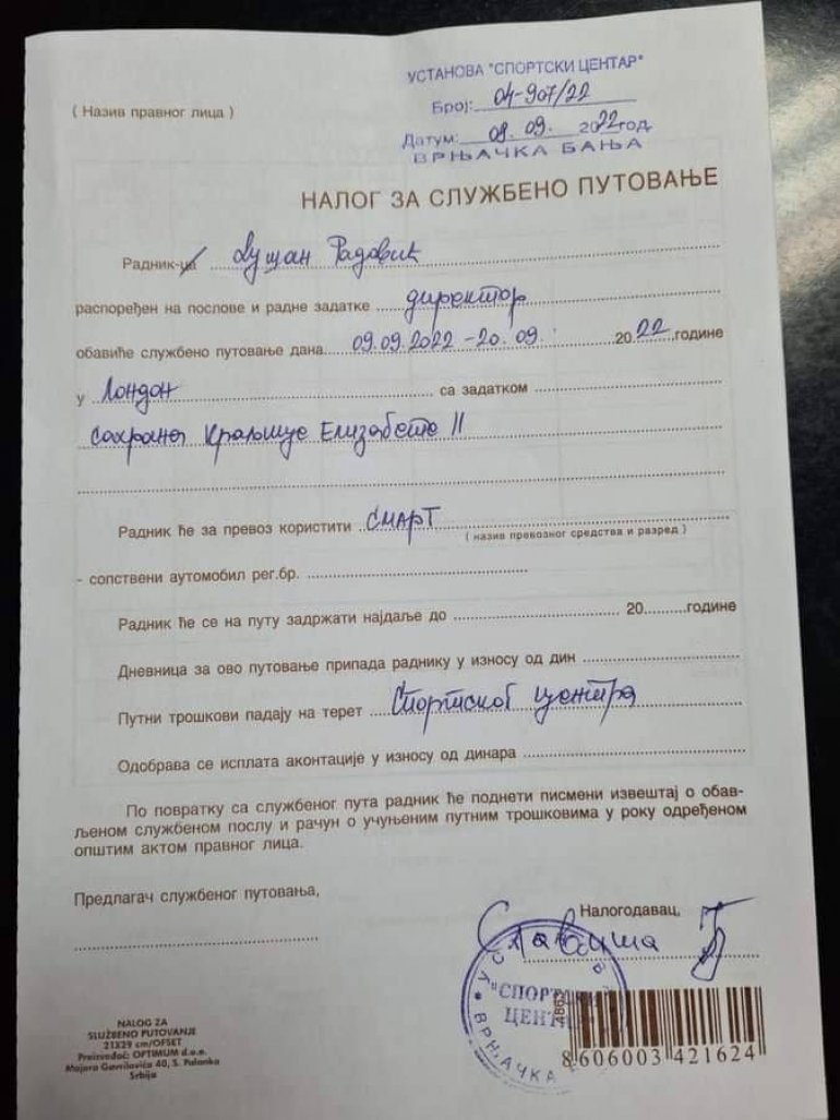 Fiktivni putni nalog napisan je za navodni službeni put direktora Radovića automobilom „smart“ u London na sahranu engleske kraljice Elizabete Druge u trajanju od 11 dana i o trošku vrnjačkog Sportskog centra.