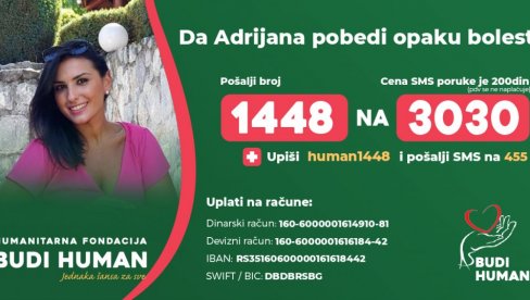 Adrijani je pre 8 godina dijagnostikovan rak bubrega, koji je nakon hirurške intervencije kojom joj je odstranjen jedan bubreg i primene 4 ciklusa hemoterapije uspešno savladala, ali krajem 2021. godine uspostavljena joj je dijagnoza zloćudni tumor kičmenog stuba, zbog čega je ponovo bila podvrgnuta hirurškom lečenju. Kao posledicu bolesti ima i paraplegiju pa se kreće samo uz pomoć ortopedskih pomagala. Obzirom da se operacijom tumor nije mogao u potpunosti ukloniti, lečenje je nastavljeno hemoterapijama i zračenjem.