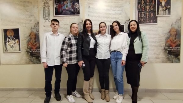 Učenici Danica Đokić, Danijela Vasić, Sanja Jevtić i Marko Matić održali su istorijski čas ispred izložbe posvećen Nemanjićima, koji je pripremljen uz podršku nastavnice istorije, Milade Tomić.
