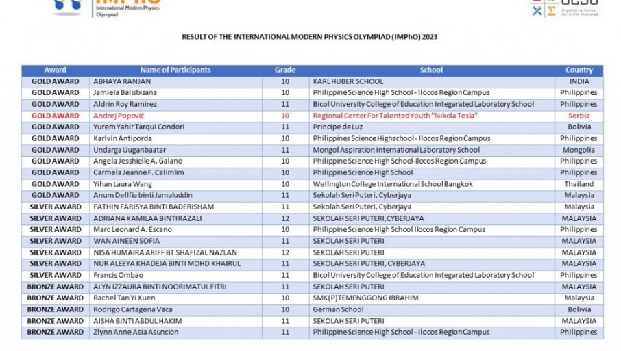 NAGRADA SANU, PA ZLATO NA SVETSKOJ OLIMPIJADI: Novi uspeh gimnazijalca iz Kikinde na takmičenju iz fizike