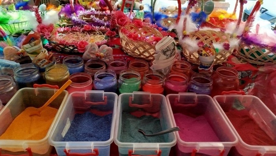 Neizbežne farbe za jaje koštaju isto kao i lane - kašiičica najtraženije crvene boje je dvadeset dinara, a u kesici deset. Najskuplje korpice kod naše sagovornice su 800 dinara, a ima i dosta jeftinijih.