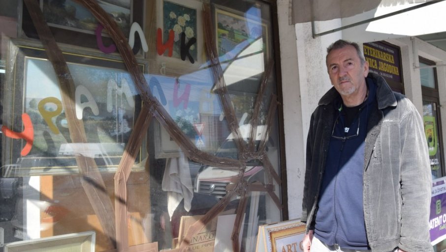 Prema rečima Srđana Ivanovića iz Jagodine, koji već pet godina radi u radnji za uramljivanje slika, neko je u najlon od cigareta uvio kamen i razbio izlog koji čine dva debela stakla. Dokaze je predao policiji radi veštačenja. Huligani nisu uspeli da "završe posao", ali je Ivanoviću naneta šteta od oko 500 evra.