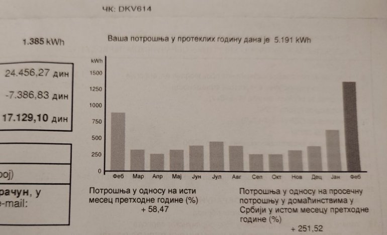 - Za minulih godinu dana potrošio sam ukupno 5.191 kilovat, a samo u februaru 1.385!? Uložio sam reklamaciju, a dobio sam nemušto objašnjenje da je brojilo poslednji put očitano početkom novembra i da je ovo račun za tri meseca. Na pitanje zašto je onda i kako na grafikonu iskazana i potom naplaćena potrošnja za novembar, decembar i januar kada brojilo nije očitano, šalterska službenica nije umela da pojasni prebacujući nadležnost na centralu u Beogradu, dispečerski centar u Sijaćem Polju i ko zna još gde – ogorčeno kaže Milinko Đ., penzioner iz grada na Ibru.