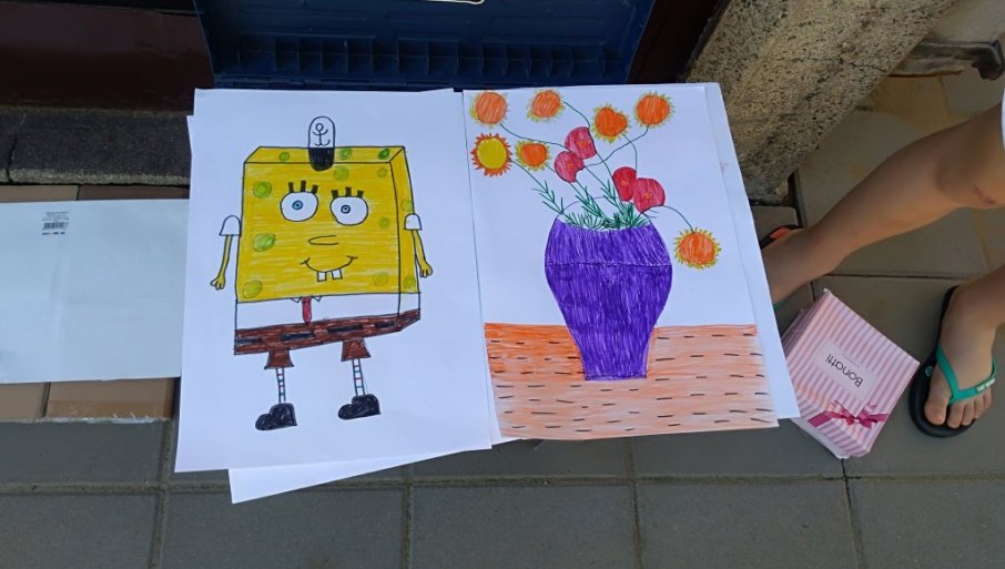 Reč je o dečaku i devojčici, bratu i sestri, očigledno nižeškolskog uzrasta, koji nude na prodaju raznobojne crteže životinja, ljudi, cveća i junaka crtanih filmova.