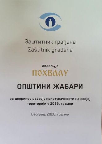 OPŠTINA Žabari dobitnik je pohvale za doprinos razvoju pristupačnosti na svojoj teritoriji u 2019. godini, koju na osnovu javnog poziva dodeljuju zaštitnik građana, Tim za socijalno uključivanje i smanjenje siromaštva Vlade Republike Srbije i Stalna konferencija gradova i opština.