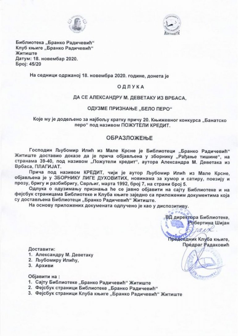 Na sednici biblioteke i Kluba knjige "Branko Radičević" iz Žitišta, koja je održana u sredu 18.novembra, doneta je odluka da se Aleksandru M. Devetaku iz Vrbasa, oduzme priznanje "Belo pero", koje mu je dodeljeno za najbolju kratku priču 20. književnog konkursa "Banatsko pero" , pod nazivom "Požuteli kredit", jer je utvrđeno da je plagijat.