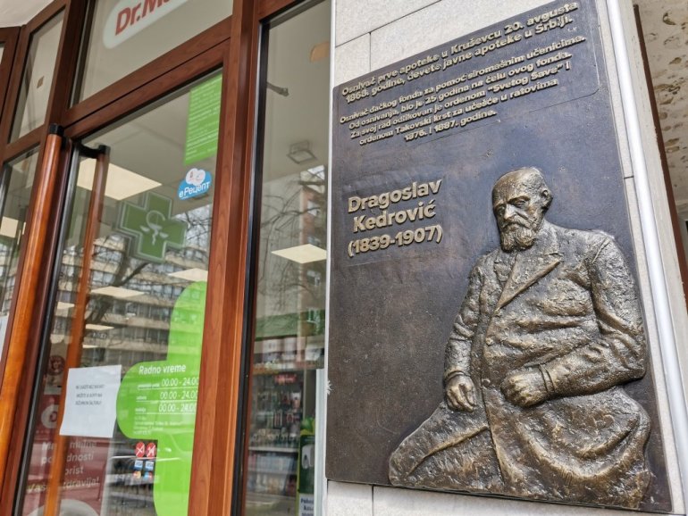 GODINU dana nakon što je potpisan ugovor sa koncesionarom "Dr Maks", iznad lokala gde je smeštena slavna apoteka "Kedrović" u Kruševcu, ponovo stoji njeno ime, a na ulazu u apoteku je postavljena i ploča sa podacima o prvom ovdašnjem školovanom farmaceutu Dragoslavu Kedroviću (1839-1907).