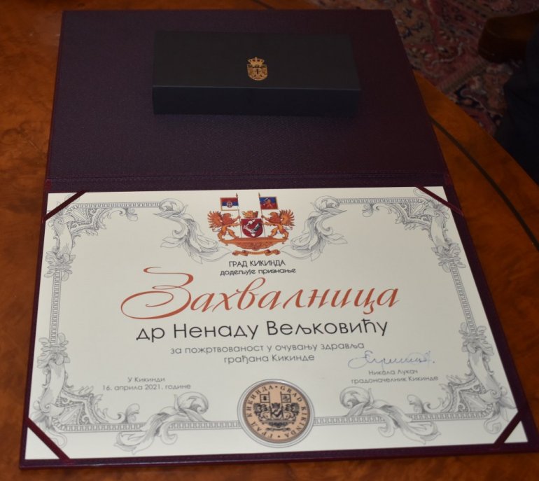 INTERNISTA Opšte bolnice u Kikindi dr Nenad Veljković u petak je od gradonačelnika Nikole Lukača dobio zahvalnicu za požrtvovanost u očuvanju zdravlja građana Kikinde tokom pandemije korona virusa.