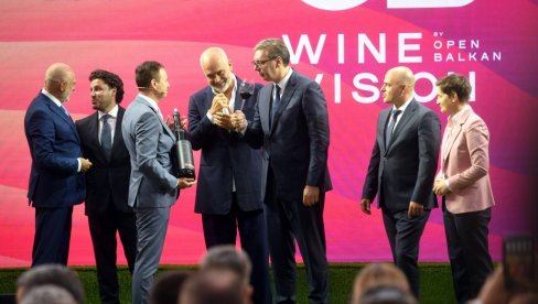 PREDSEDNIK Srbije Aleksandar Vučić učestovao je na otvaranju Četvrtog međunarodnog sajma vina, hrane, rakije i turizma Vinska vizija Otvorenog Balkana u Hali 1 Beogradskog sajma.