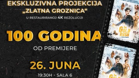U GODINI globalnog obeležavanja 100 godina od premijere legendarnog nemog filma Čarlija Čaplina „Zlatna groznica“ (The Gold Rush) 26. juna u 19.30h u mts Dvorani biće održana ekskluzivna specijalna projekcija, restauriranog filma u 4K rezoluciji, na dan kada je pre tačno jednog veka, čuveni film doživeo svoje prvo prikazivanje.