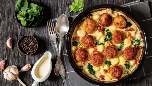Pileće ćufte sa njokama prave se u aromatičnom belom sosu i dodatno posipaju kačkavaljem.