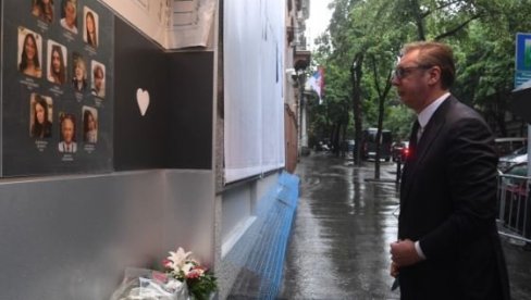 PREDSEDNIK Republike Srbije Aleksandar Vučić položio je cveće u školi "Vladislav Ribnikar" na godišnjicu ubistva devet učenika i radnika obezbeđenja ove škole.