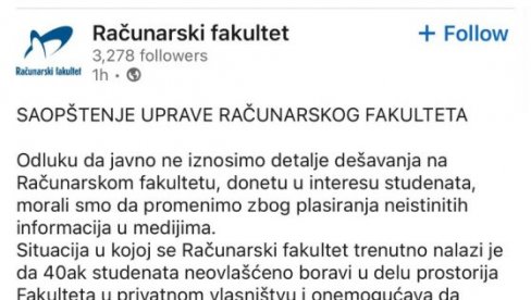 RAČUNARSKI Fakultet objavio je saopštenje za javnost zbog plasiranja neistinitih informacija.