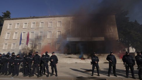 ŠEST policajaca povređeno je danas u sukobu sa demonstrantima tokom protesta u centru Tirane na koji je pozvala opozicija tražeći ostavku vicepremijerke Belinde Baluku zbog navodne kroupcije, a okupljeni građani bacali su Molotovljeve koktele na zgradu vlade Albanije.