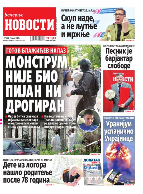 Večernje novosti - Naslovna strana - Štampano izdanje za 17.05.2023.