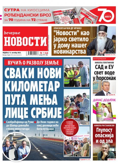 Večernje novosti - Naslovna strana - Štampano izdanje za 15.10.2023.