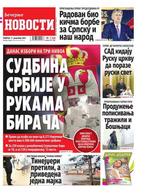 Večernje novosti - Naslovna strana - Štampano izdanje za 17.12.2023.