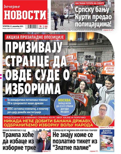 Večernje novosti - Naslovna strana - Štampano izdanje za 21.12.2023.
