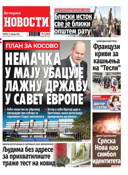 Večernje novosti - Naslovna strana - Štampano izdanje za 13.01.2024.