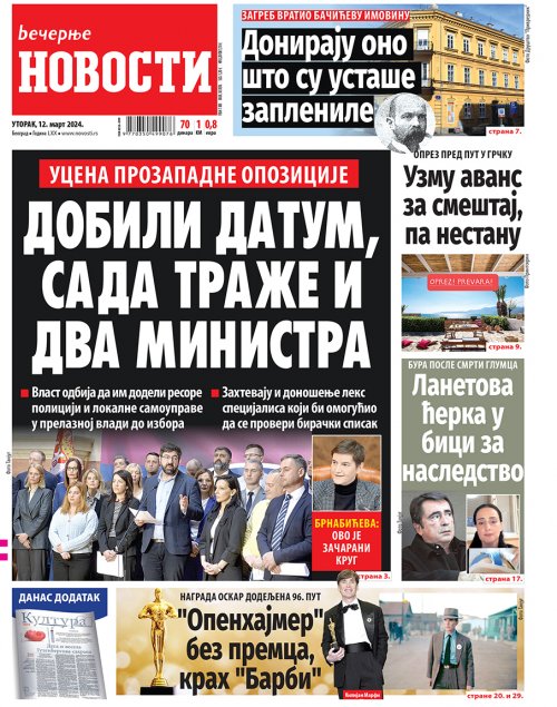 Večernje novosti - Naslovna strana - Štampano izdanje za 12.03.2024.