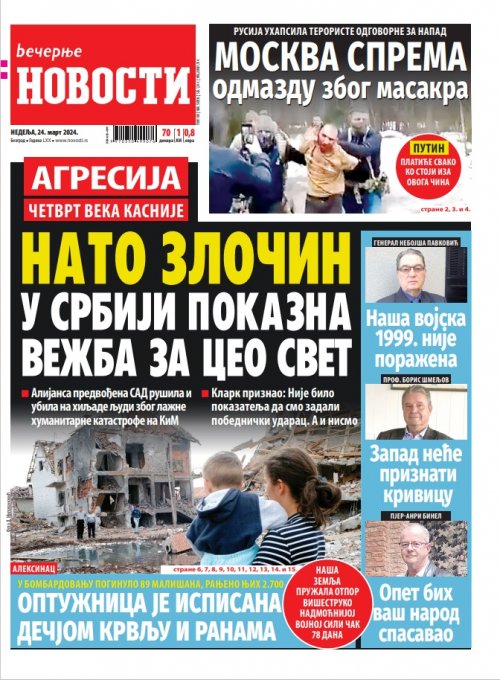 Večernje novosti - Naslovna strana - Štampano izdanje za 24.03.2024.
