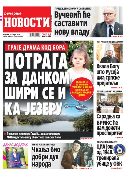 Večernje novosti - Naslovna strana - Štampano izdanje za 31.03.2024.