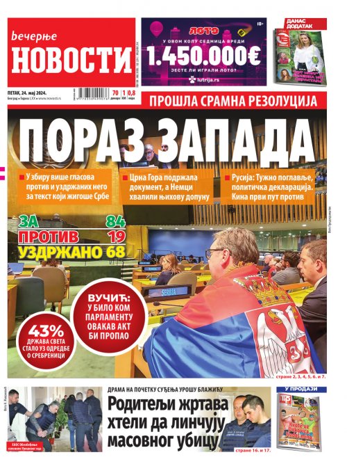 Večernje novosti - Naslovna strana - Štampano izdanje za 25.05.2024.