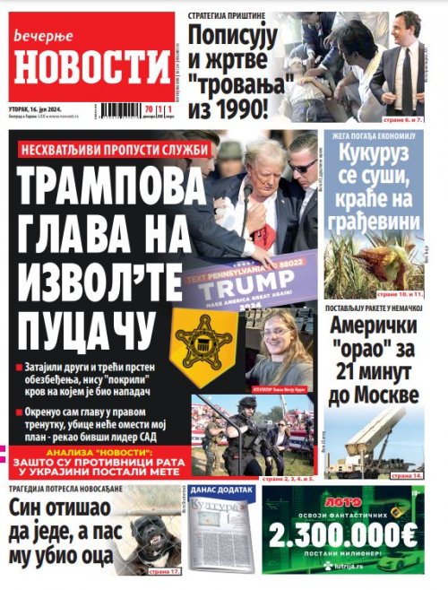 Večernje novosti - Naslovna strana - Štampano izdanje za 16.07.2024.
