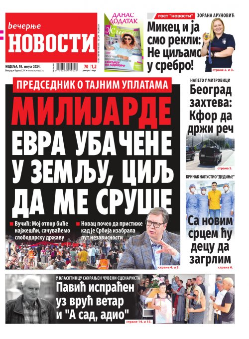 Večernje novosti - Naslovna strana - Štampano izdanje za 18.08.2024.